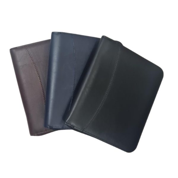 Cubierta con carpeta y cierre de cremallera. Portafolio interior con fuelle, costuras artesanales.