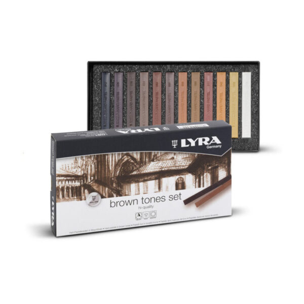 Un estuche de 12 tizas pastel para uso artístico, con tonos marrones intensos y brillantes. Los bordes permiten definir pequeños detalles, mientras que la parte plana de la tiza permite colorear áreas más amplias. Los pigmentos tienen un alto poder cubriente y una elevada adhesión. Son excelentes para realizar bocetos a color y se recomienda utilizarlos junto a los Lyra Polycrayons Soft.